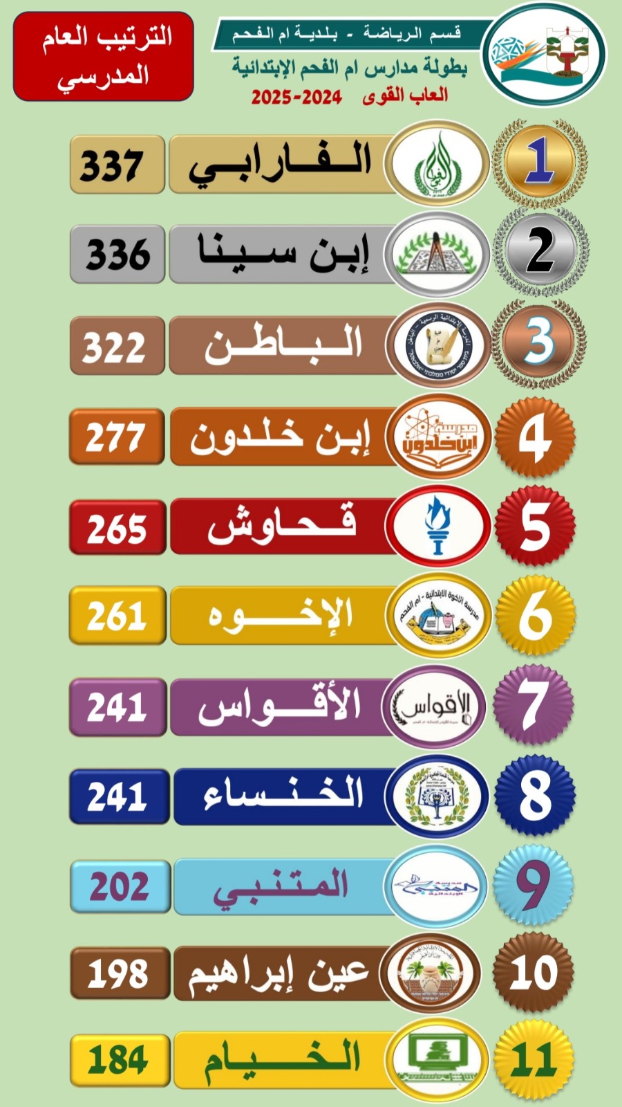 ضمن البطولة السنوية لألعاب القوى لمدارس ام الفحم نظم قسم الرياضة في بلدية ام الفحم بطولة المدارس الابتدائية لالعاب القوى في اجواء كرنفالية وبمستوى تنظيم عالٍ، وبمشاركة 11 مدرسة ابتدائية حصدت مدرسة الباطن بطولة الطالبات في الترتيب العام بينما حصدت مدرسة ابن سينا بطولة الطلاب فيما تربعت الفارابي الترتيب العام للطلاب والطالبات.