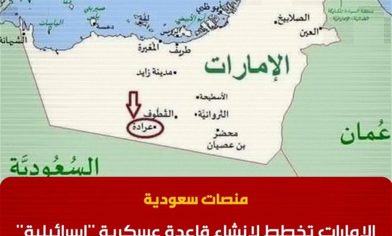 أفادت منصات سعودية بأن الإمارات العربية المتحدة تخطط لإنشاء قاعدة عسكرية إسرائيلية على أراضيها، يُتوقع أن تستوعب أكثر من 800 جندي إسرائيلي.